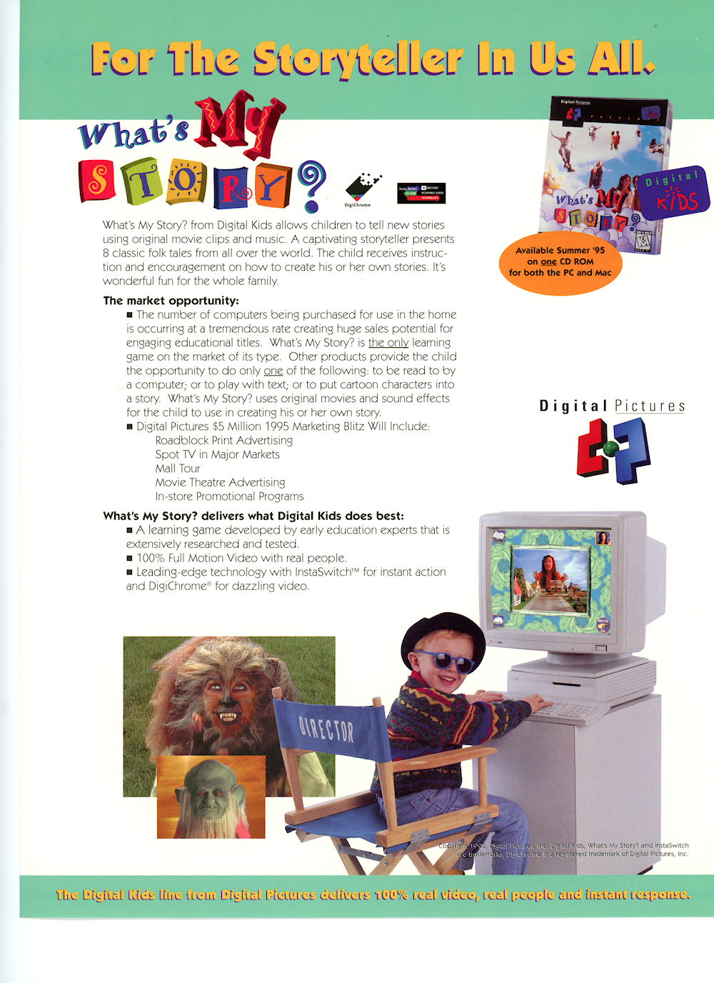 What's My Story? was the first software that let children create stories by mixing hundreds of movies, music and sound effects with their own recorded voice. Kids of all ages will spend endless hours narrating their own stories as varied as their imaginations with the free easy-to-use microphone.
