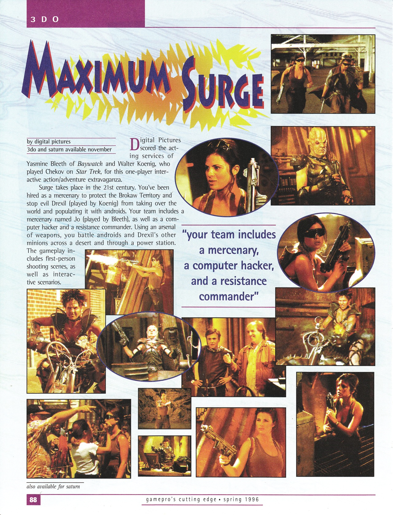 * The first FMV-based action game that gives you the power to create your own world by choosing from a variety of interior and exterior enviornments for customized game play. * Multiple game levels and over 20 types of enemies. * Choose your firepower from a range of personal and onboard weapons. * Strategize the management of your energy resources and tactical strikes, * Stars Yasmine Bleeth of "Baywatch" and Walter Koenig of "Star Trek." |