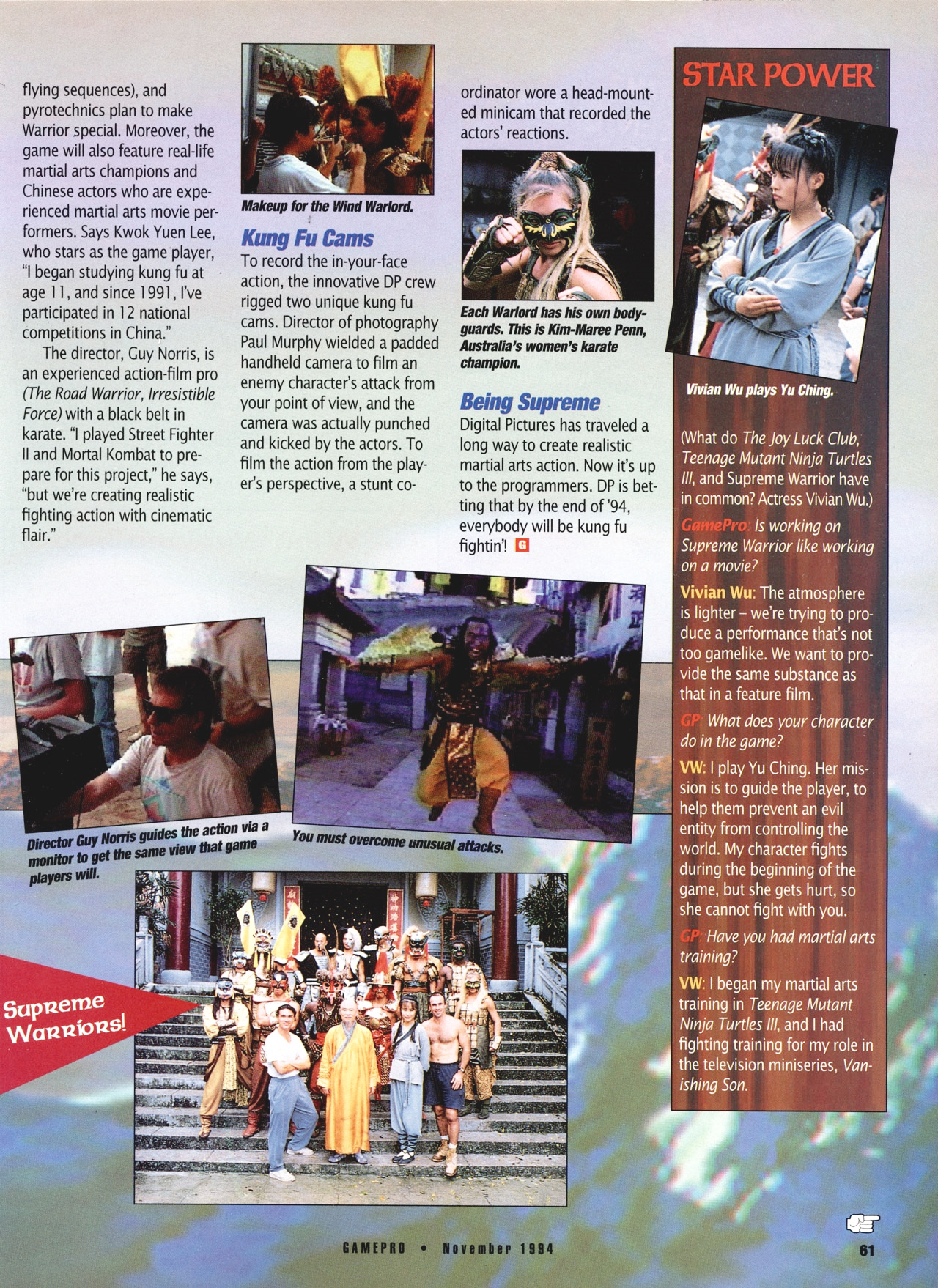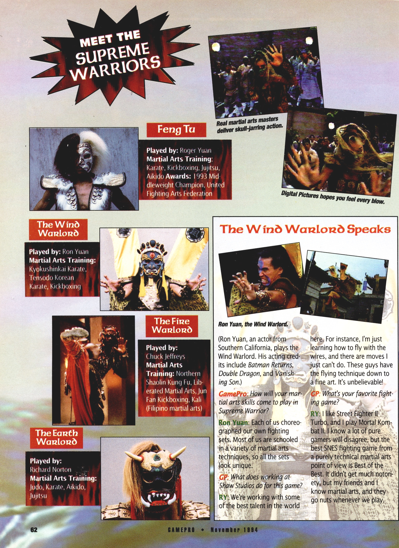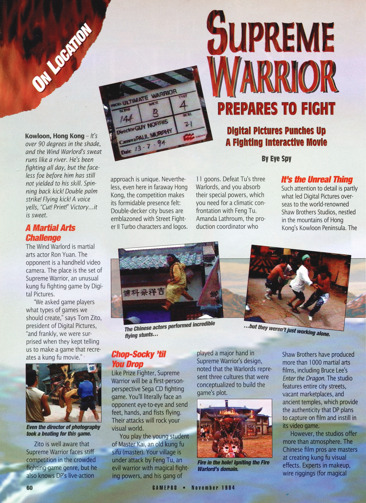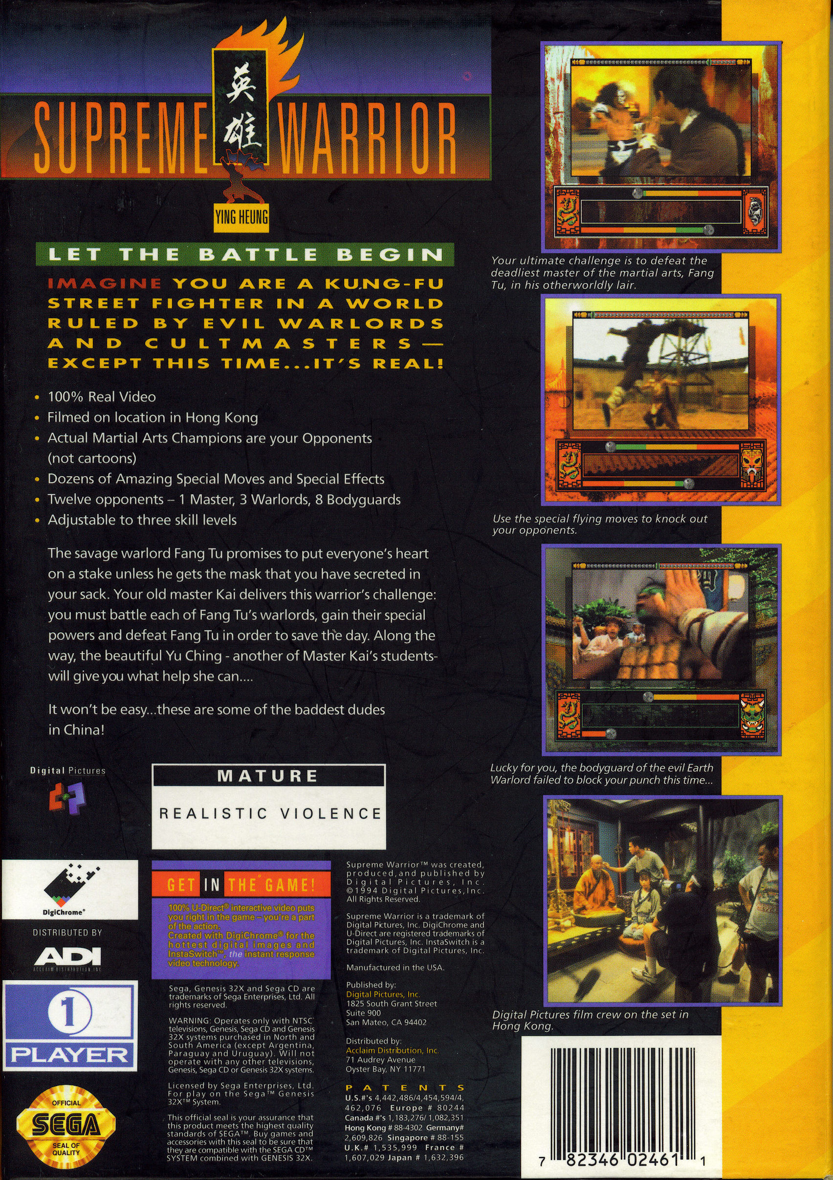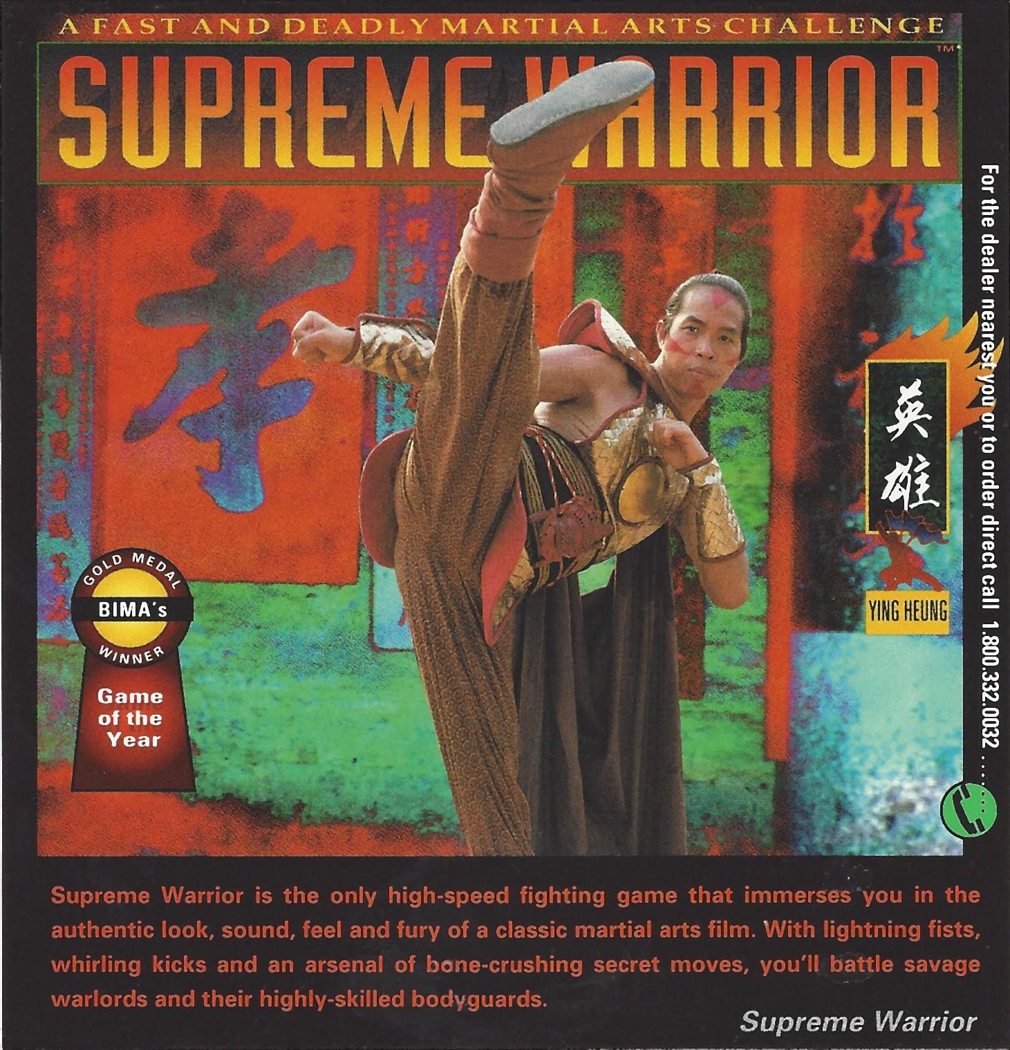 Supreme Warrior is the only high-speed fighting game that immerses you in the authentic look, sound, feel and fury of a classic martial arts film. Using lightning fists, whirling kicks and an arsenal of bonecrushing secret moves, you'll battle savage warlords and their highly-skilled bodyguards. Over 20 authentic martial arts moves at your instant command: palm heels, spin kicks, hooks, roundhouses, flying shadow kicks. Twelve opponents to beat, portrayed by top martial arts champions from around the world. Photo-realistic graphics created in Hong Kong at the legendary Shaw Brothers studios. |